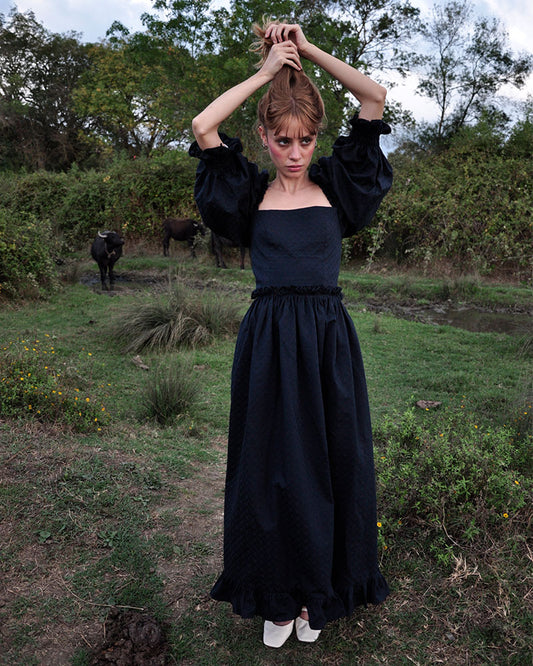 BALON KOLLU KORSAJ DETAYLI UZUN ELBİSE