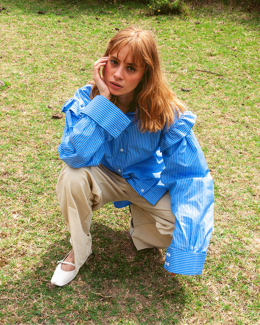 ÇİZGİLİ VOLAN DETAYLI OVERSIZE GÖMLEK