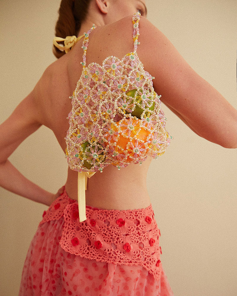 El boyama ile renklendirilmiş boncuklar, tamamen elde örülmüştür. Artan kumaşlardan yapılan kese, çantaya dahildir ve ayrı kullanıma uygundur.